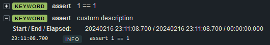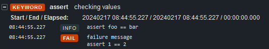 assert "foo" == "bar" # hidden from the robot log (when run with --no-assertions-in-robot-log)